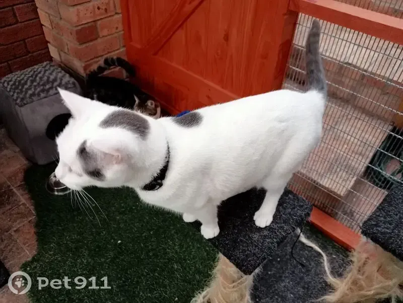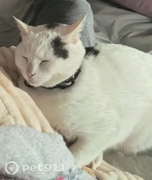 White with a black mark above her left eye and behind her head. She's very friendly at home, but might be skittish outside. She grew up as inside cat. She wears a black collar.