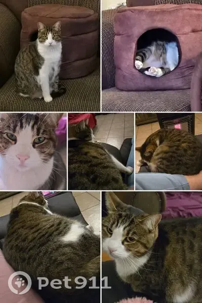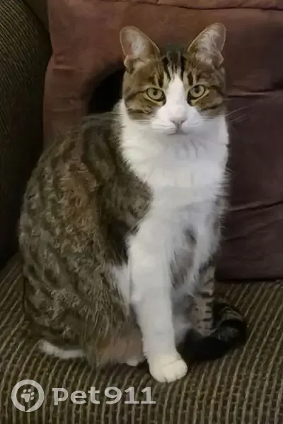 Brown and white tabby. Three legs brown, right leg completely white. Very friendly and loving. Ivy is chipped but no color. Dissappeard from home.