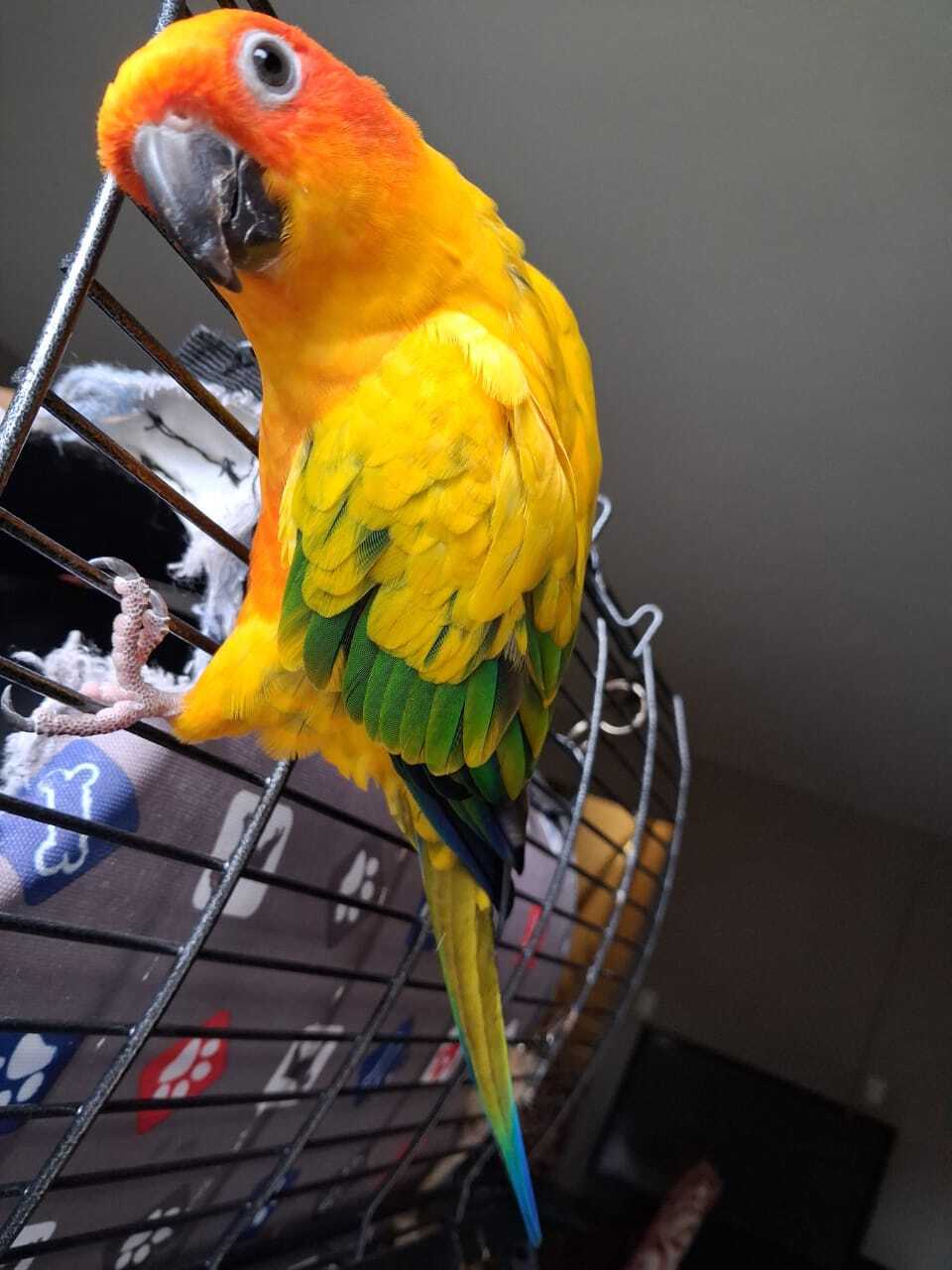 Bright yellow predominately with red around his eyes on face and green on the end of his wings and tail. He also has some blue on his tail. He is the same size as a cockatiel .