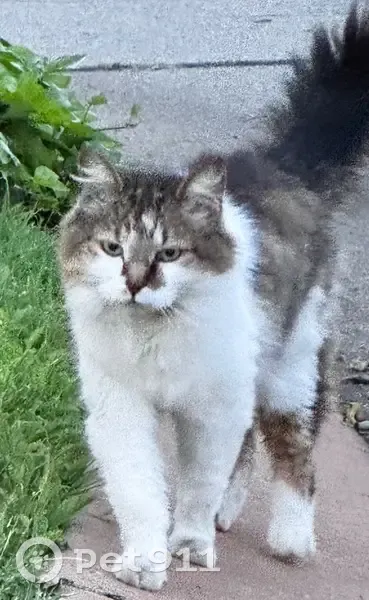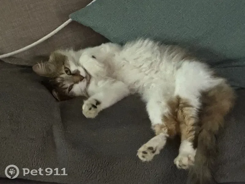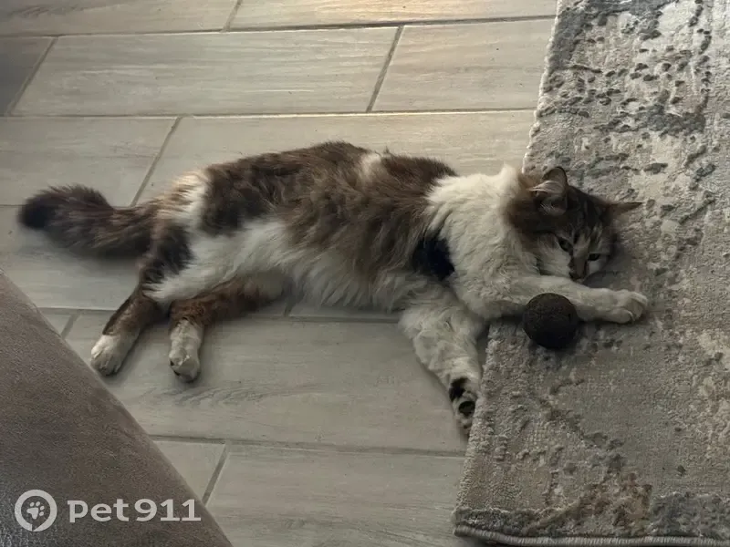 Very social cat who loves getting cuddles from anyone. She has green eyes. Her coat is white with tortoiseshell areas. She has a very small frame. Very sweet natured. She disappeared from the complex which she is very familiar with and known to roam about.