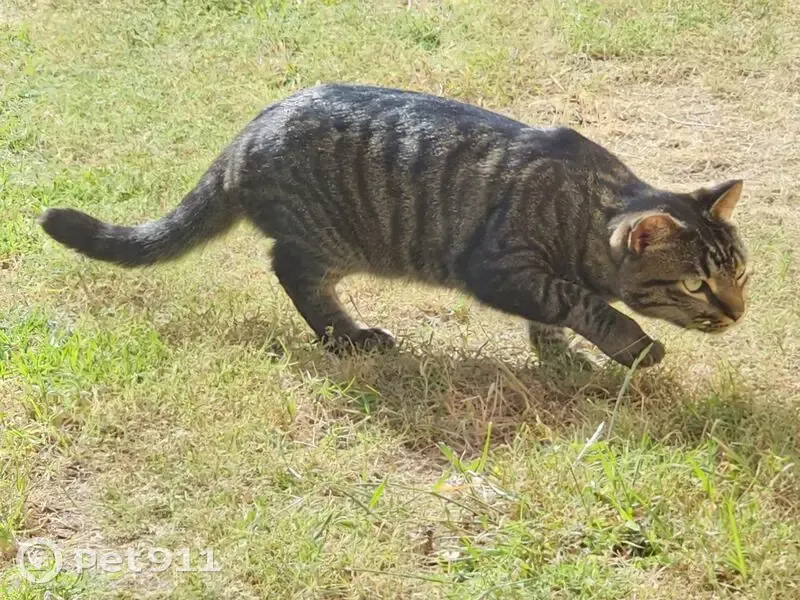 Tiggers coat colour is black,brown and some white strips. He is very smart and shy very curious and love watching cars and catching birds. Always looking for a cool spot. He disappeared Tuesday night. We think It might have been the heat wave that drove him away in search for a cool place to lay low for a while. He has a black collor with a bronze bell attached to it.