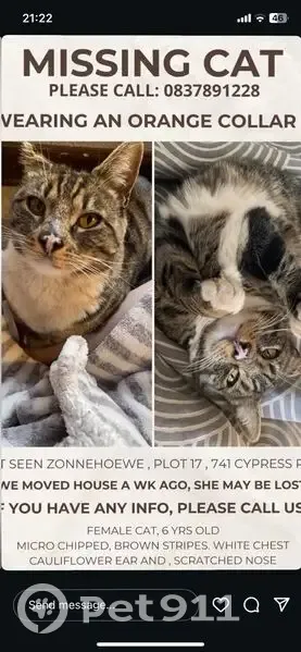Sage is a 6.5 year old brown, striped tabby. Female. Last seen wearing a bright orange collar. She has a cauliflower ear and a pink/scratched nose. White chest and paws. She is spayed and micro-chipped. Slim build. We moved into the area (Zonnehoewe) a week ago, she managed to escape and go missing on Sunday (7 December 2025). She found us as a feral kitten and is dearly loved, please help us find her.